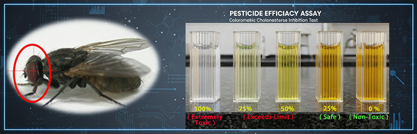 When fruit and vegetable extracts contain organophosphates or carbamates, these pesticides inhibit acetylcholinesterase (AChE) activity, preventing the enzyme from reacting with the colorimetric reagent.