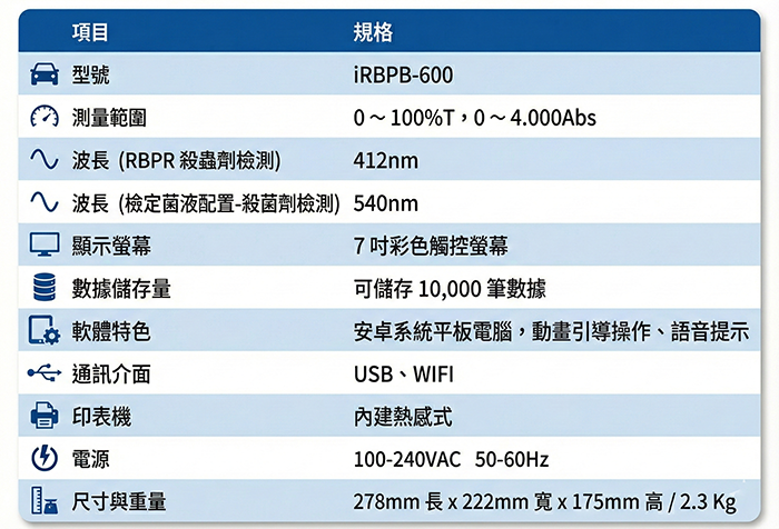 i-RBPB-600 檢測儀是專為搭配酵素抑制率法試劑片套組設計的專業比色光度計。它不再讓您依賴肉眼判斷微小的顏色差異,而是透過精確的光電轉換技術,將試劑的呈色反應轉化為客觀、穩定的數位數據(農藥抑制率 %)。這款儀器是建立科學化、標準化食安內控體系的必備工具。